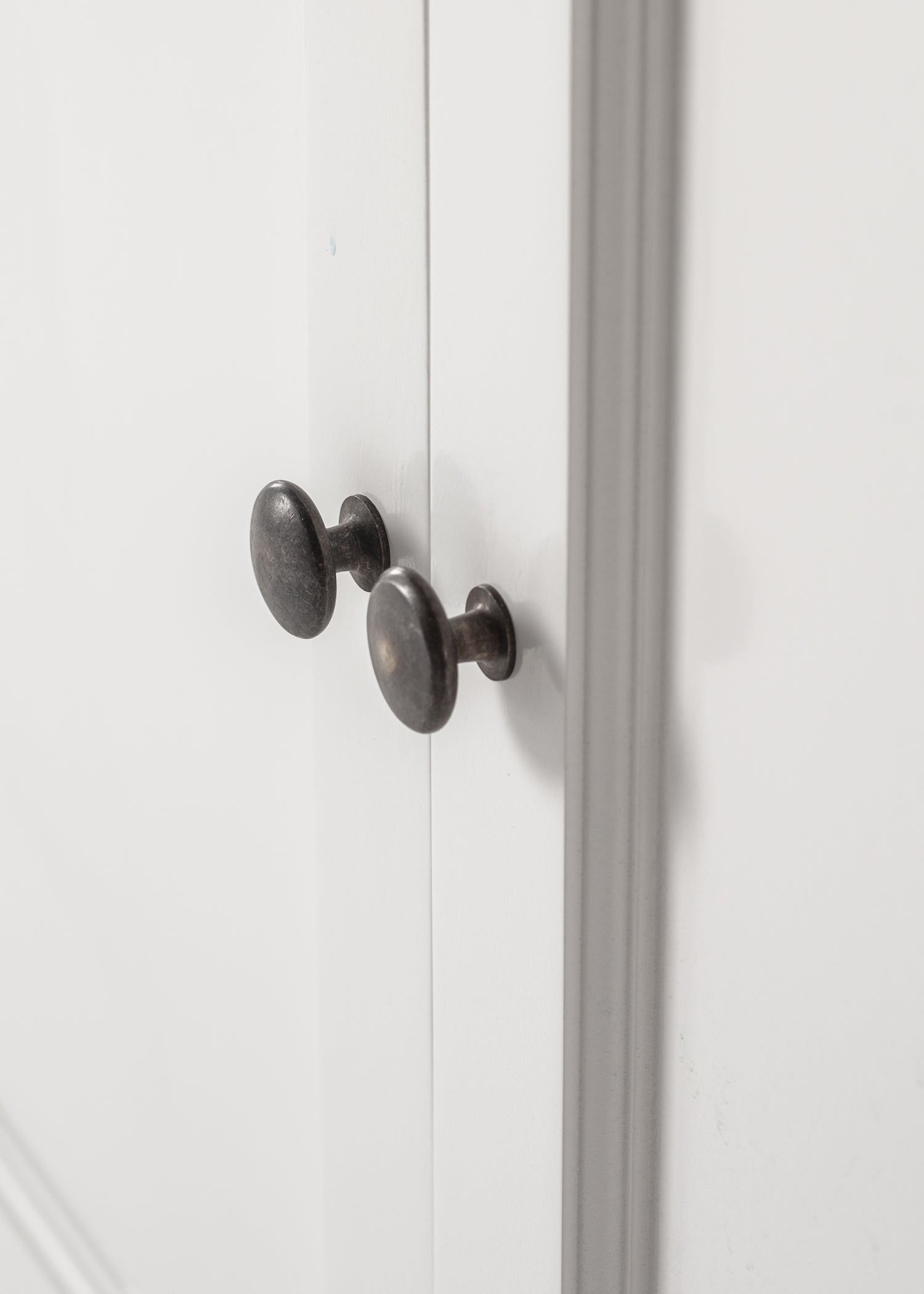Equipped with vintage-inspired cup pulls and round knobs in antique brass, blending seamlessly with the classic white finish. -