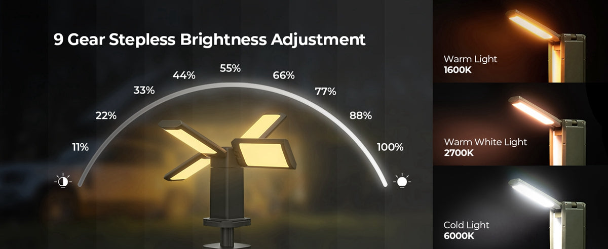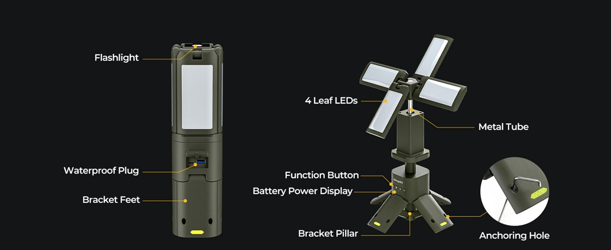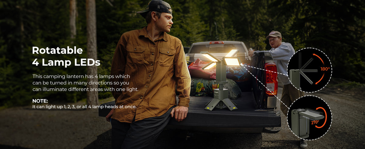 Experience camping like never before with our multi-directional camping lantern, designed to brighten every corner of your campsite. Featuring 4 independently rotatable LED lamp heads, this innovative lantern lets you customize your lighting—use one for a soft glow or all four for full 360° illumination.