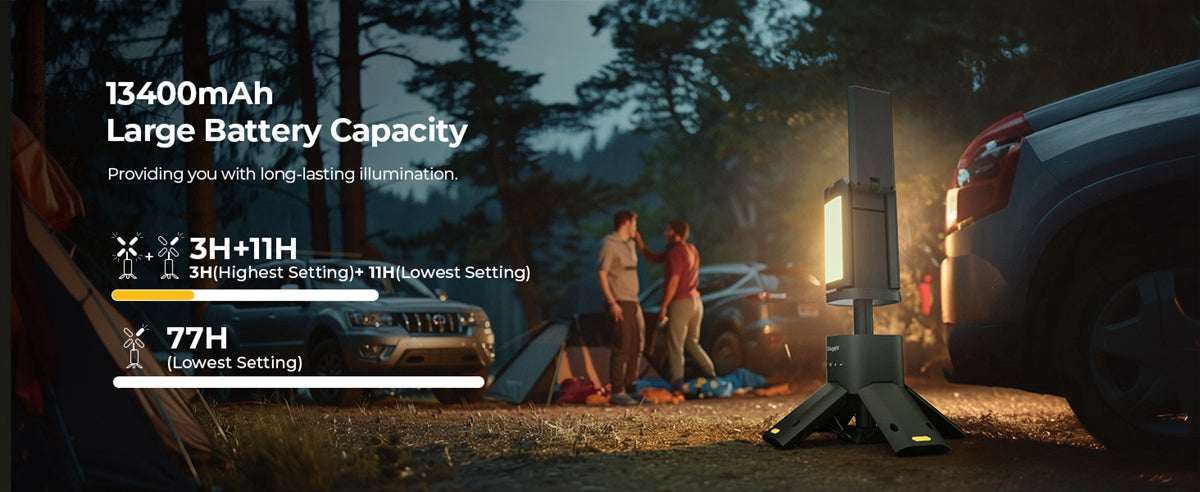Powered by a massive 13,400mAh rechargeable battery, it delivers long-lasting, reliable light for hours—perfect for overnight stays, emergencies, or late-night hikes. Crafted for durability and energy efficiency, it's built to withstand rugged outdoor conditions while conserving power.