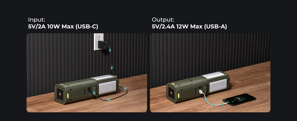 - Input: 5V/2A 10W Max (USB-C), Output: 5V/2.4A 12W Max (USB-A)