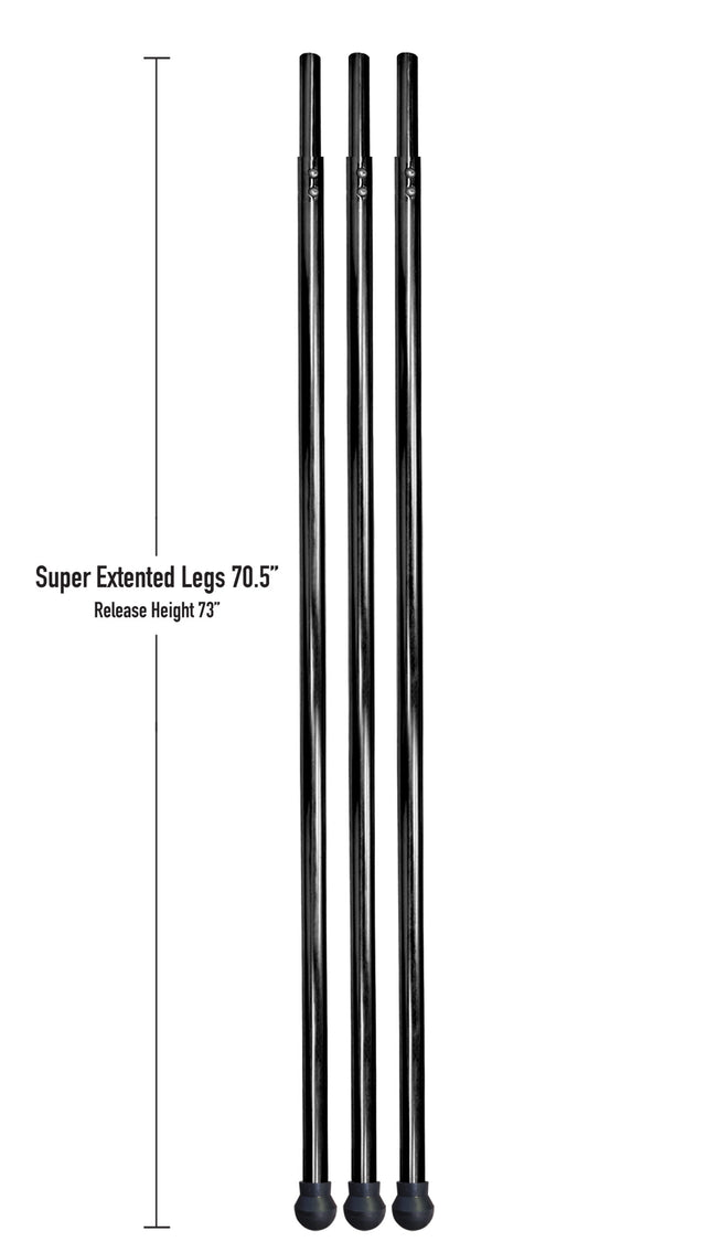 Set of three (3) super extended legs for the Junior Hack Attack Baseball Pitching Machine. Legs measure 70.5″, raising the ball release height to 73″.